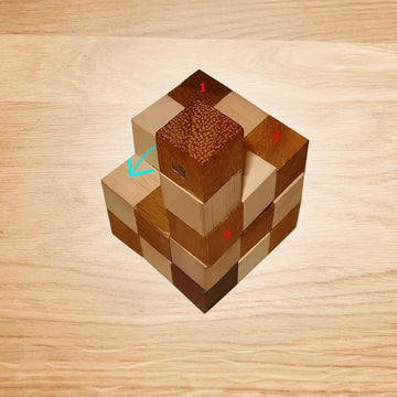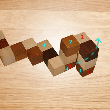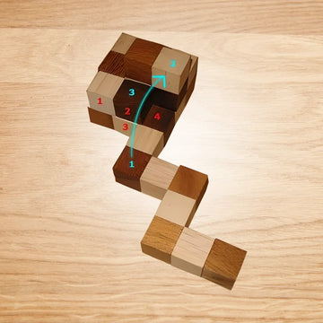 The solution is presented as a series of illustrated positions. In each picture, specific cubes will bear blue numbers, acting as reference points for locating corresponding cubes in the subsequent picture, marked with red numbers. Certain moves will be briefly explained using text and directional arrows for clarity