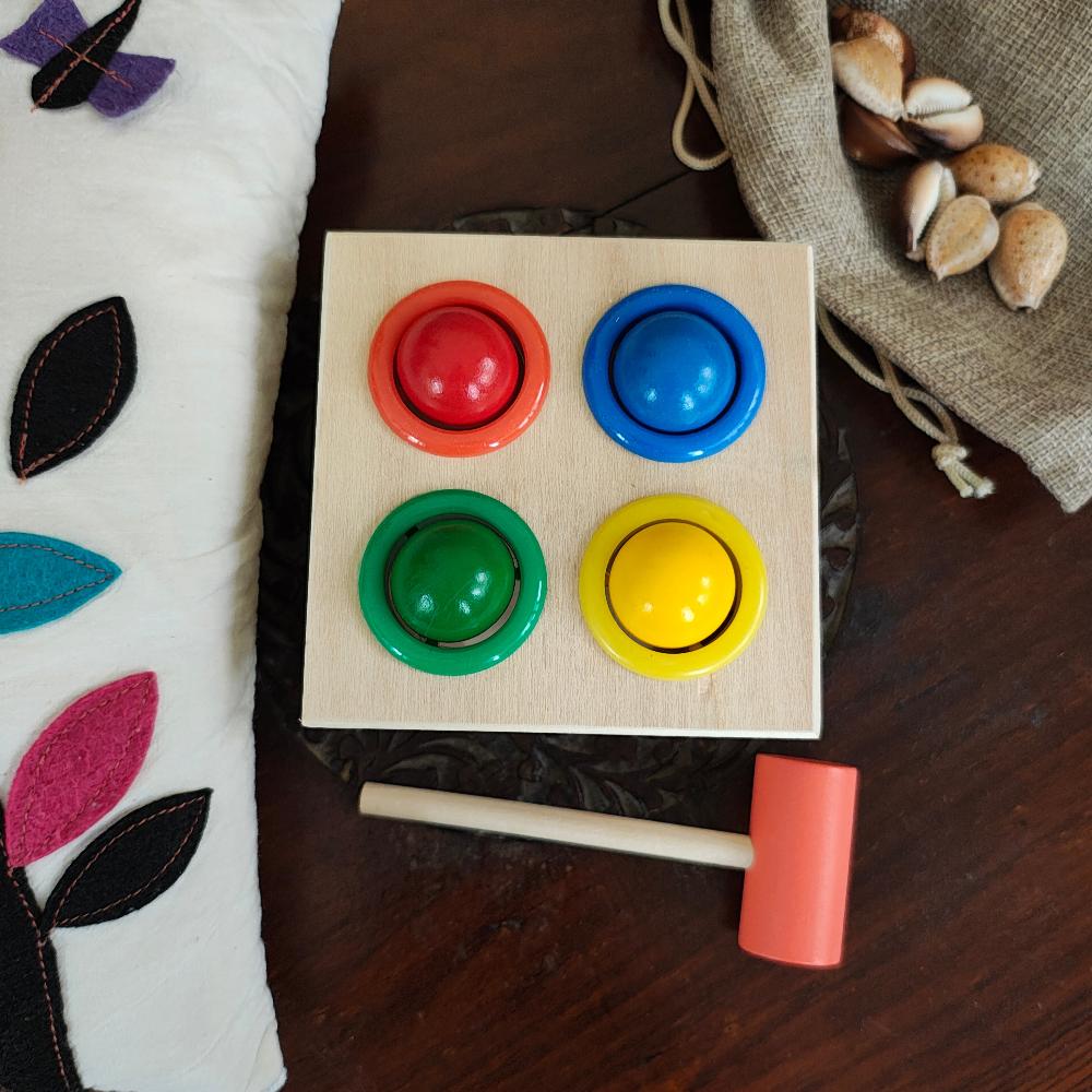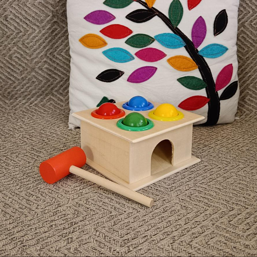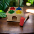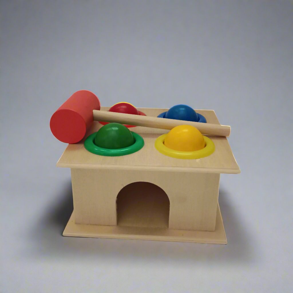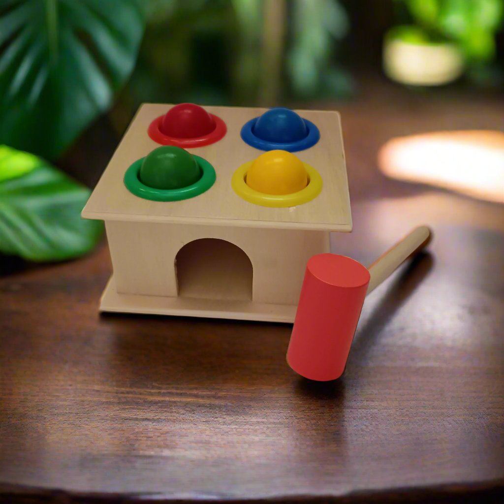 Unleash hours of excitement with this vibrant wooden hammer and ball game. Perfect for curious toddlers, this game keeps them entertained as they hammer colourful balls through the holes, flip the bench, and repeat the fun all over again. It's not just a toy—it’s an engaging way to develop essential skills through hands-on play.